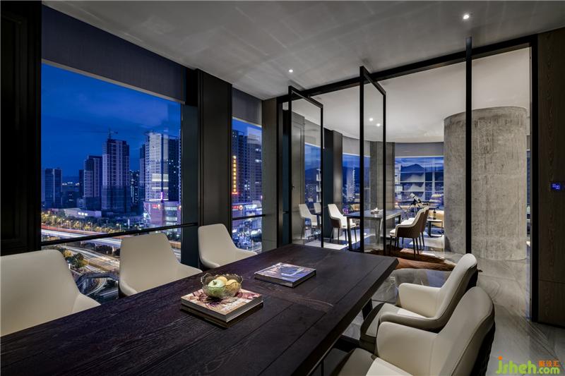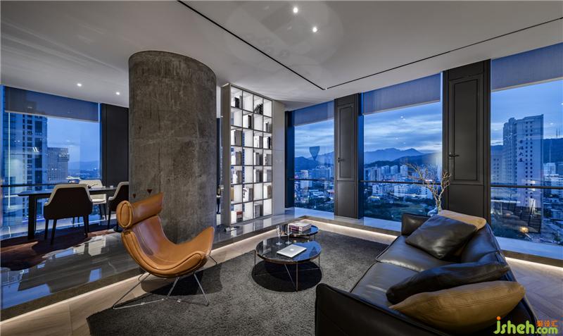 俯瞰整條向南延伸的龍巖大道,洽談區(qū)與茶室是整個(gè)工作室觀景的最佳位置。三開(kāi)的玻璃門(mén)兼具隱私與透明,保持與其他區(qū)域的通透與聯(lián)接,契合精致、穩(wěn)重的空間需求。巧妙使用藍(lán)色點(diǎn)綴黑白的空間,帶來(lái)亮色的感官體驗(yàn),呈現(xiàn)安靜卻不失力度的張力。