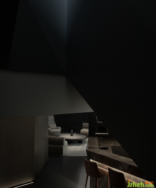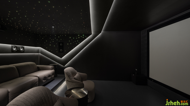 在吧臺(tái)共飲時(shí)光,感受情感在夜色中激蕩。橫折錯(cuò)落的空間體塊勾勒出冷峻與炙熱的質(zhì)感。在影音室,古今故事緩緩展開(kāi),情愫隨熒幕灑入空間。星光點(diǎn)點(diǎn),光帶連接遠(yuǎn)近,柔軟的沙發(fā)托舉著心靈的河流。聚散交錯(cuò),仿佛寰宇中的星辰軌跡,在冥冥中相遇交融……
