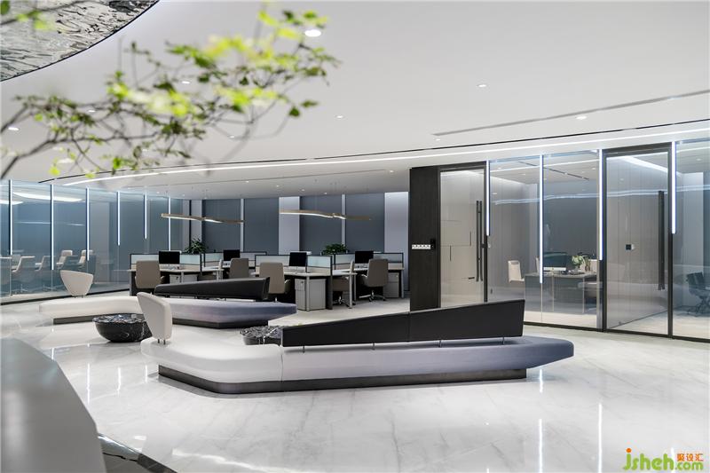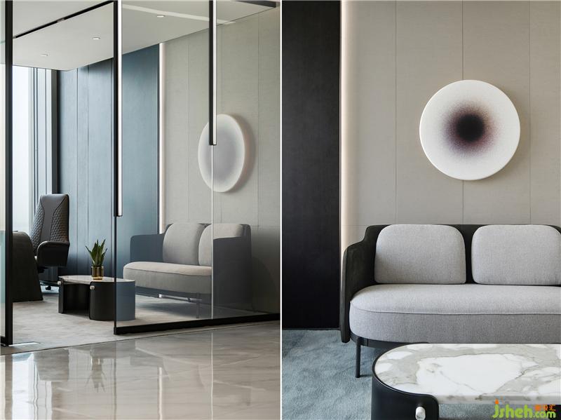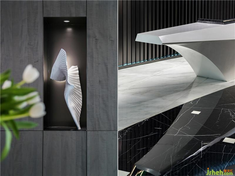 藝術(shù)是空間的底色,藝術(shù)作品應(yīng)當(dāng)具有人文關(guān)懷和文化啟蒙。設(shè)計師根據(jù)行業(yè)屬性及企業(yè)文化創(chuàng)作的雕塑作品“源”,通過一層層的亞克力、形似煤炭的石子,疊加構(gòu)成樹的姿態(tài),形成虛實的變化,也成為吸引人駐留的一隅清凈處。