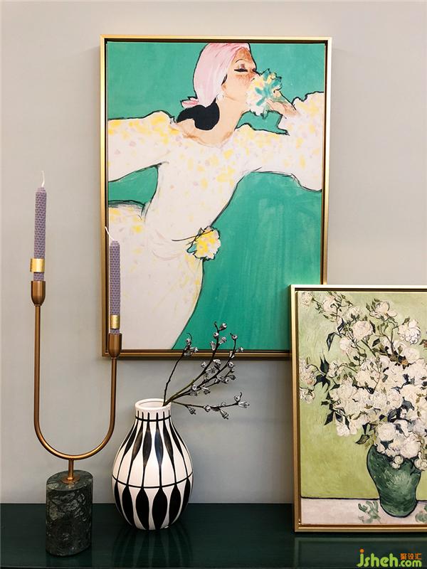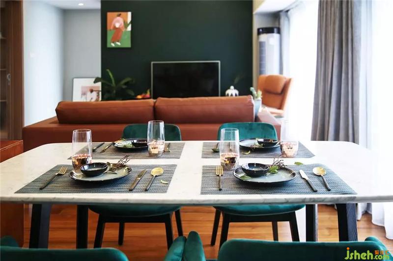 ▲我們確定了主色調(diào)之后,通過兩種方式來體現(xiàn)主色調(diào):大面積和高頻次,通過電視背景墻的色彩大面積定調(diào),再通過小物體的不斷重復(fù),比如同色調(diào)的掛畫、綠色大理石的花器、餐墊、抱枕、柜子的門板等不管是什么綠色都屬于一個色調(diào)。