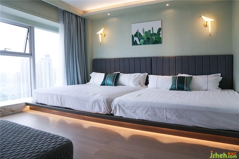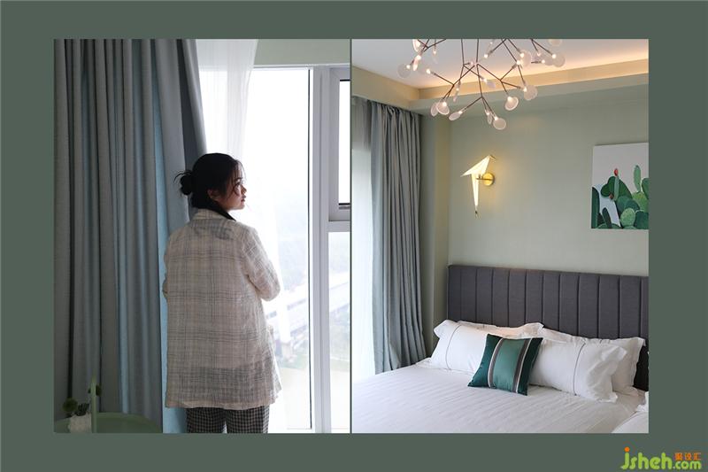 臥室延續(xù)客廳的設(shè)計(jì)元素,色調(diào)稍作緩和,大面積淺綠色讓人如沐春風(fēng)。