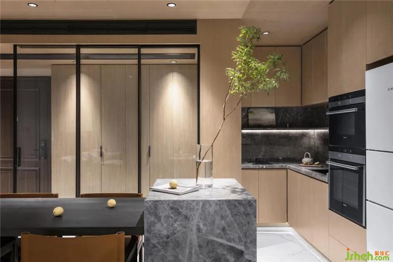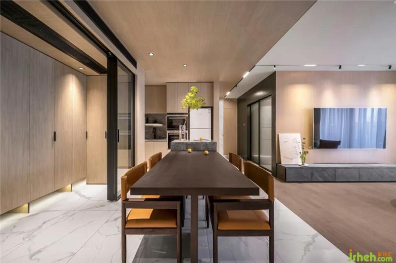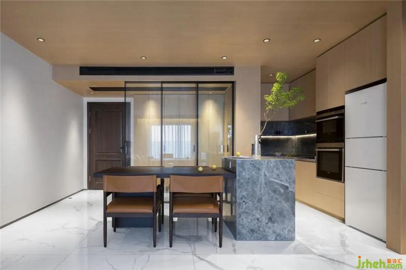 把和諧平衡的精神之美,轉(zhuǎn)化到空間的具體形式,從天花到房間對開門到地面材質(zhì)都用了對稱均衡設計,除了反映陰陽平衡概念,也考慮到使用功能,廚餐區(qū)域雖然沒有實體的分割,但通過材質(zhì)的拼接,視覺上形成功能分區(qū),給人以工整、大氣、和諧之感,變成了獨有的生活美學。