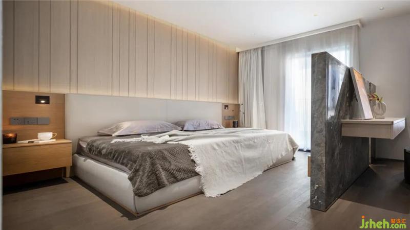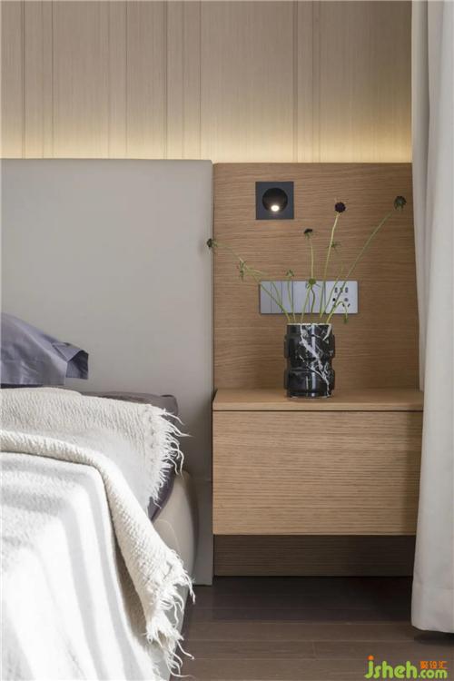臥室的床和床頭柜做成了一個整體,這樣的活動家具在市場上很難買到,所以選擇了定制,這樣就可以根據(jù)喜歡的尺寸和材質(zhì)搭配,空間沒有過多的裝飾,通過燈光營造氛圍和層次。