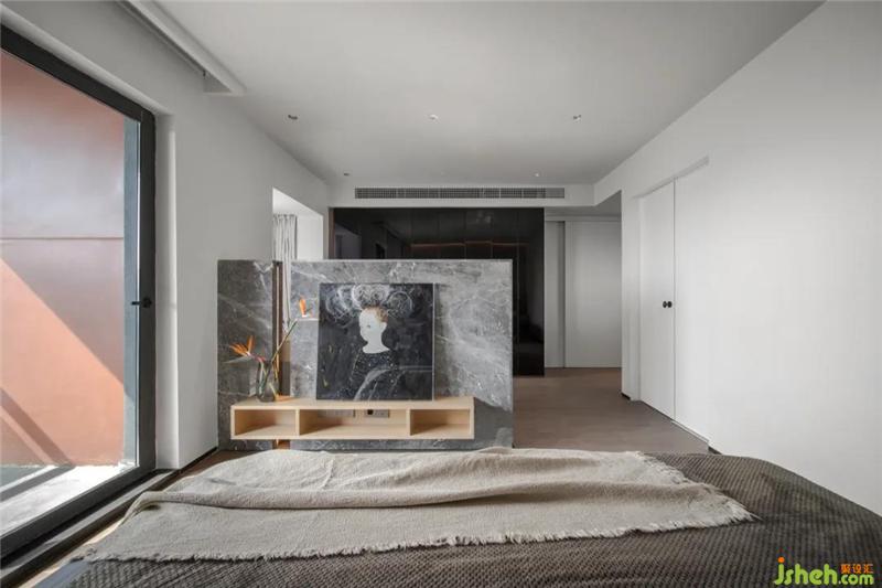 靠近主臥的房間與主臥打通,用于滿足屋主對于梳妝及衣帽間空間的需求深圳裝修設(shè)計,整體更加開闊,在兩個空間之間做了一個半墻的設(shè)計,后期可以懸掛電視。
