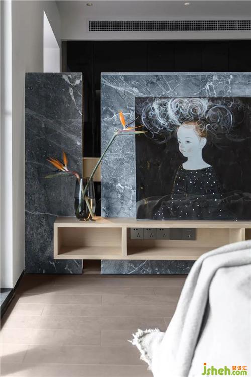 主臥房門門套及墻面為現(xiàn)場制作,門扇外訂,門邊一公分寬的木飾面也是木工師傅一點點貼上去的。盡量讓空間材質(zhì)形成一體,連而不黏,在制作時強調(diào)紋理的連續(xù)性。在去“門把手”這個事情上驚喜地和業(yè)主達成一致,采用了地彈簧的形式解決開關(guān)門的問題。