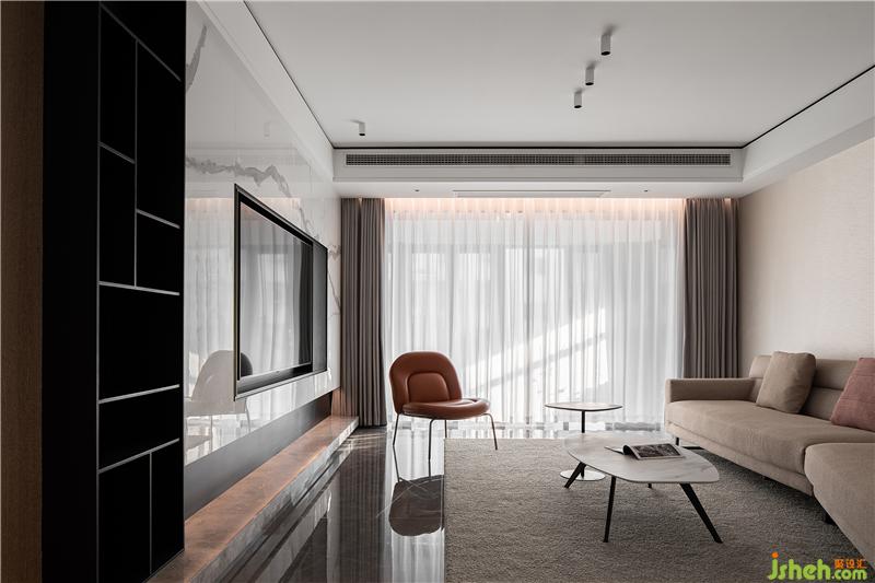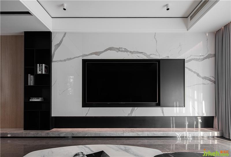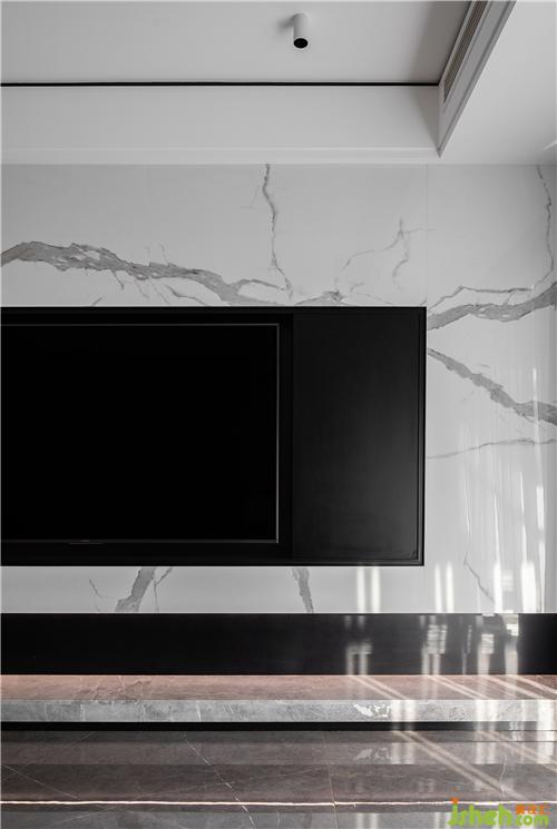 電視內(nèi)嵌入銀白色大理石內(nèi),沉穩(wěn)的黑色矩形收邊,沒有多余的線條,使得空間氛圍更加沉穩(wěn)且易打理。