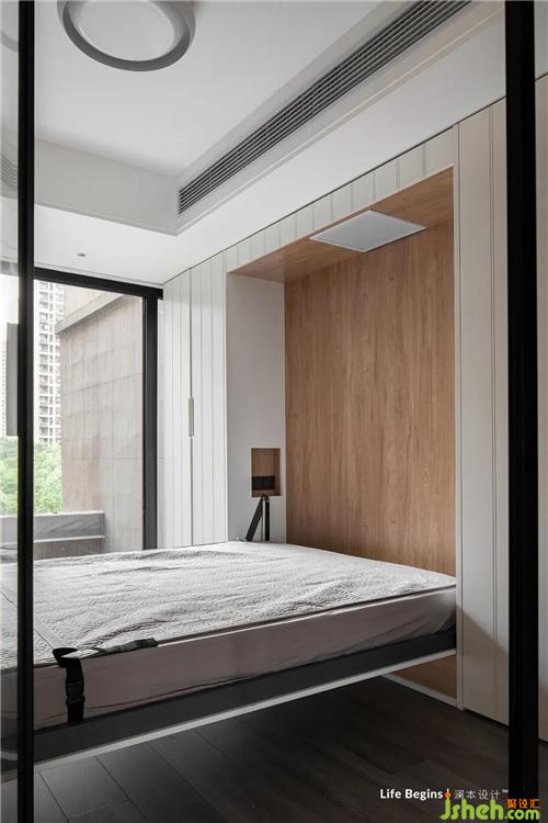 柜門(mén)打開(kāi),放下隱形床后,多功能房便瞬間轉(zhuǎn)變?yōu)橐婚g溫馨次臥。