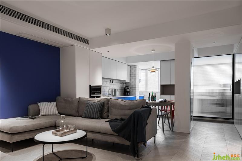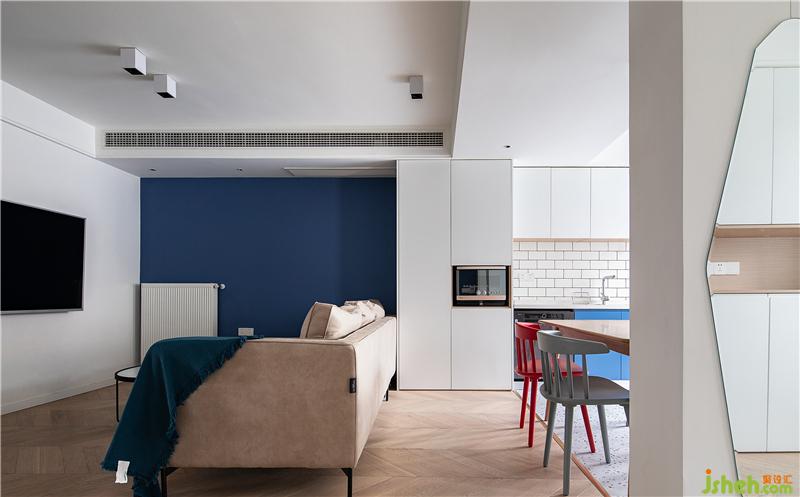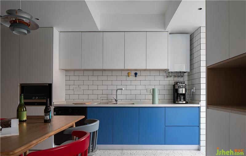 ▲廚房櫥柜的藍(lán)色與客廳相呼應(yīng),形成色彩豐富卻不雜亂的統(tǒng)一