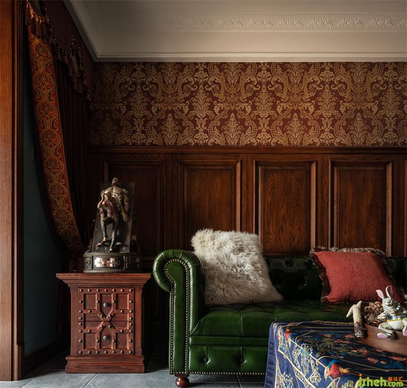 墻紙窗簾都用了復(fù)古的酒紅色系,與墨綠相碰撞,這種高飽和度的顏色對比更能體現(xiàn)古堡和宮廷的華麗和張揚,絲絨和羊毛材質(zhì)搭配溫潤的木頭,又能增加空間的質(zhì)感,更貼合古堡的風(fēng)格,茶幾上的暗黑小丑兔邪惡又迷人~強行入鏡。