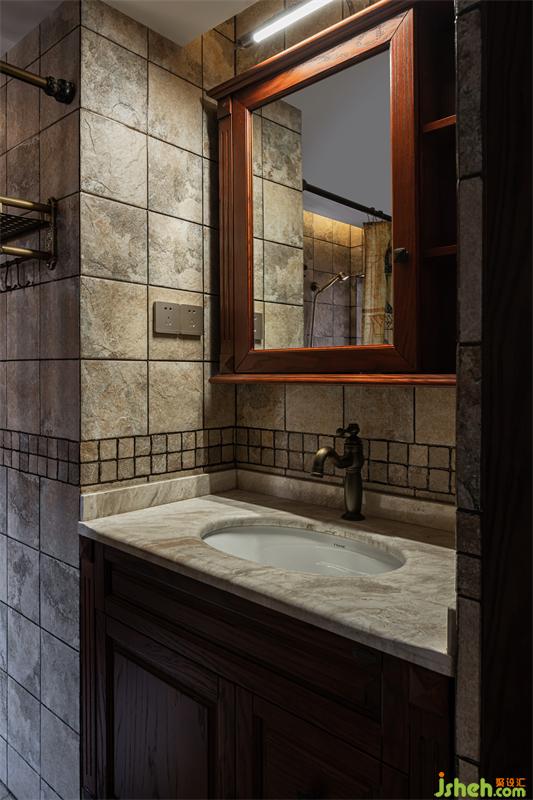 衛(wèi)生間的洗臉池借用了兒童房的空間,定制了橡木的柜體和鏡柜,呼應(yīng)主題。所有的五金掛件和龍頭都統(tǒng)一采用了復(fù)古的古銅色,墻地磚也選了粗獷的仿巖石仿古磚,更貼近古堡的感覺(jué)。