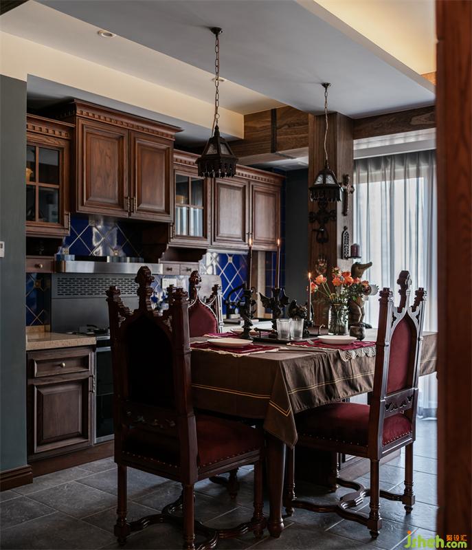 廚房也是定制了原木櫥柜,搭配深藍(lán)色的墻磚,墻磚之間還裝飾了古銅角花,更加復(fù)古。定制的絲絨餐椅加高了高度,是為了配合島臺(tái)的高度,島臺(tái)太矮的話平時(shí)站著不方便操作。島臺(tái)上的立柱其實(shí)是原始廚房的下水管,包成舊木頭柱子,被屋主掛上了自己搜羅來(lái)的各種鐵件。北陽(yáng)臺(tái)的墻被敲掉,留下很大的梁體,也用仿舊木頭的木飾面包起來(lái),營(yíng)造出古堡滄桑原始的感覺(jué),為了更加逼真,還定制了捆綁木頭的鐵件。