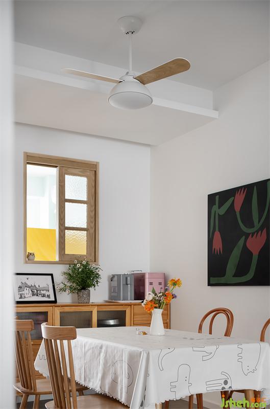 餐廳往兒童房借了一部分空間,放置了1米4的餐桌,以及一個(gè)大的實(shí)木餐邊柜,可以收納其他的烘焙工具,茶水問(wèn)題也可以在這邊解決,不再需要去廚房倒水。往兒童房的墻面開(kāi)了一個(gè)小窗戶(hù),這樣南北都有采光,窗戶(hù)用了水紋玻璃,透光又保護(hù)私密性。白色的吊扇燈文藝又實(shí)用,一家人可以愉快地用餐啦~