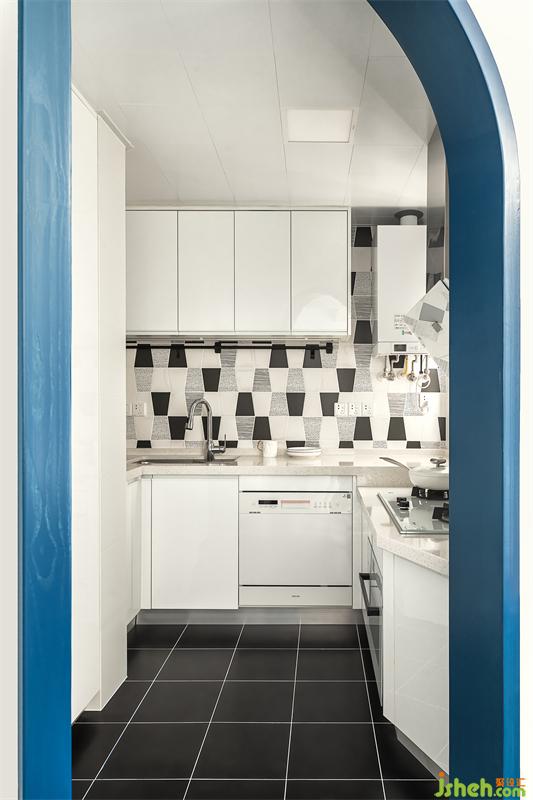 廚房不大,用黑白配的方式保留采光,顯得更加整潔。