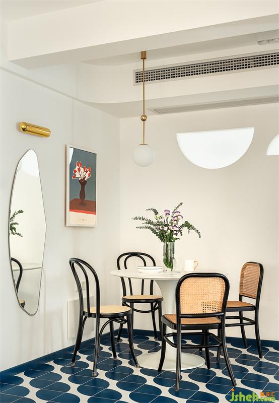 圓形的餐桌能弱化墻角的空間感。進門口選了不規(guī)則的造型鏡子,方便出門之前整理著裝,也能增加空間的層次感。