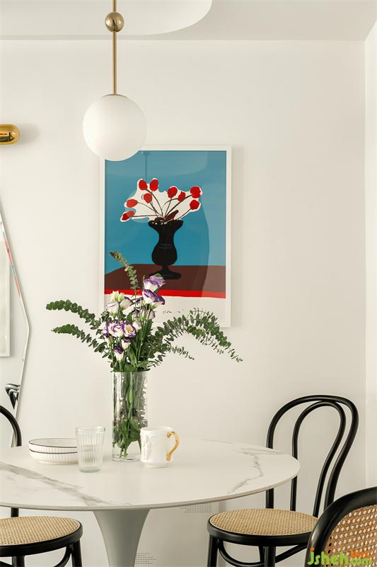 高飽和度的畫作能彰顯屋主的個性,在餐桌不擺花的時(shí)候,也能給與生活儀式感,還能遮擋背后的強(qiáng)電箱。球形吊燈簡約精致,呼應(yīng)空間的弧度。