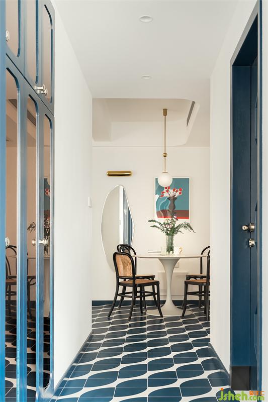 從主臥的門口看走道及餐廳。吊頂也做成了弧形,用造型感削弱空間的局促感。左邊借了墻厚做了一排儲物柜,柜門鑲嵌了茶鏡,擴(kuò)大了空間感。