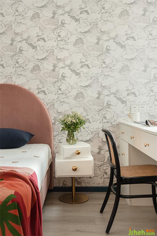 女兒房用了淡粉色的云朵墻紙,云朵仿佛在移動,有種靜謐的活力。粉色的半圓床頭將公主心進(jìn)行到底,俏皮可愛,最鮮艷的針織搭毯則是點(diǎn)睛之筆,把空間主題色的飽和度,從墻紙到床到搭毯,由低拉到最高,層次分明。