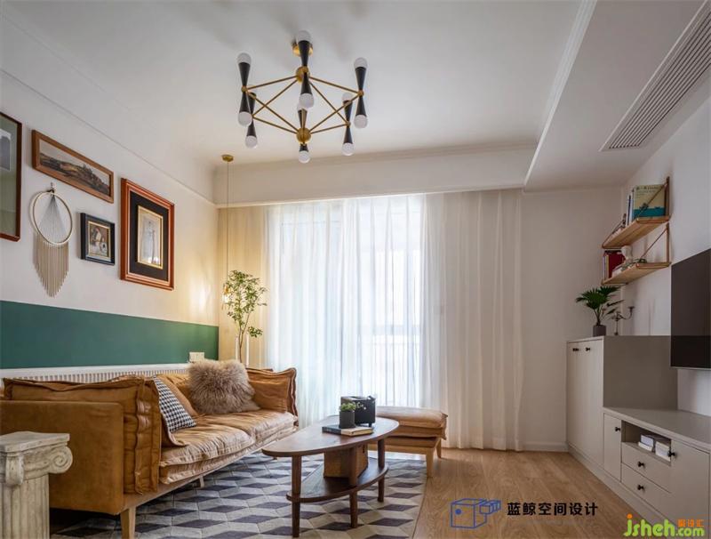 墨綠色的半墻設(shè)計(jì)增加了空間的延伸感,配上棕色的沙發(fā)立馬提升了復(fù)古感。武漢家居設(shè)計(jì)因?yàn)閴w有凹凸,電視柜是現(xiàn)場(chǎng)做的,噴了溫暖的奶茶色,顯得愜意而溫暖。沙發(fā)背后的掛畫出自故我今我。
