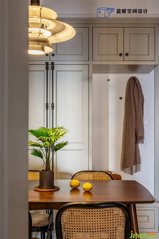 門廳做了一排餐邊柜,把冰箱和換鞋凳也收納進(jìn)來(lái),柜內(nèi)做了酒插,方便備點(diǎn)好酒招待三兩好友,柜外用了復(fù)古天地鎖,小小細(xì)節(jié)也能提升空間質(zhì)感。武漢家居設(shè)計(jì)地面是經(jīng)典黑白小磚拼花,配上Thonet的復(fù)刻藤編椅子,和PH5吊燈,文藝?yán)寺母杏X油然而生。
