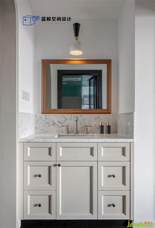 3. 衛(wèi)生間則是做了干濕分離,因?yàn)闃I(yè)主不希望鏡子面對(duì)主臥門,所以最終采用了與電視柜凹凸擺放的方式,可以做個(gè)正常尺寸的洗臉臺(tái),并且衛(wèi)生間還能放下浴缸
