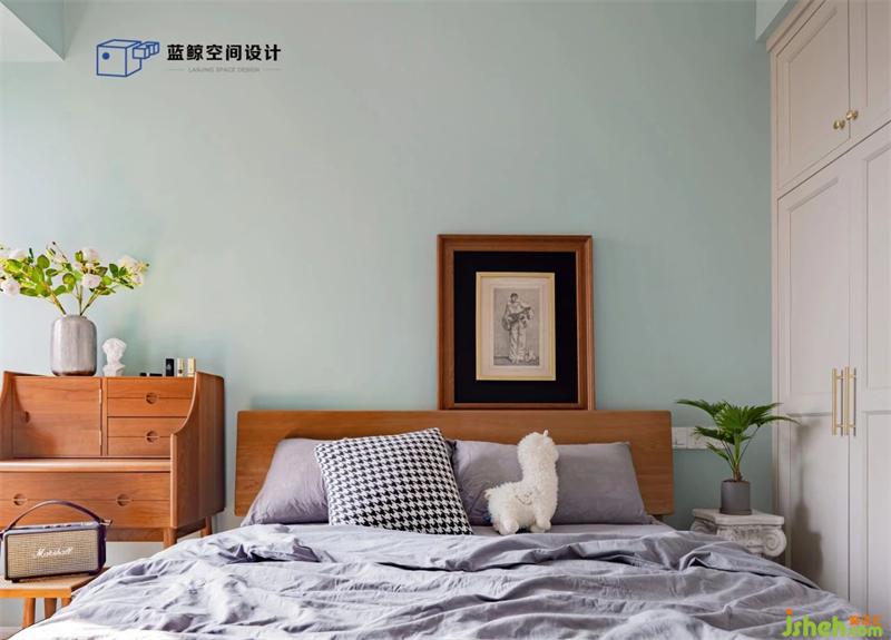 主臥用了低飽和度的綠色,呼應(yīng)客廳的主題色,進(jìn)門右手是整排的衣柜,也運(yùn)用了電視柜的奶茶色。梳妝臺(tái)出自二黑木作,收納能力強(qiáng)大。