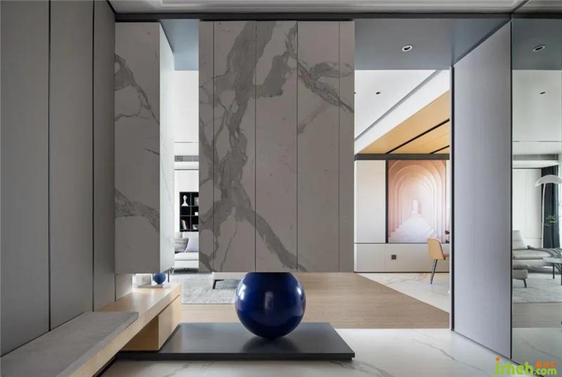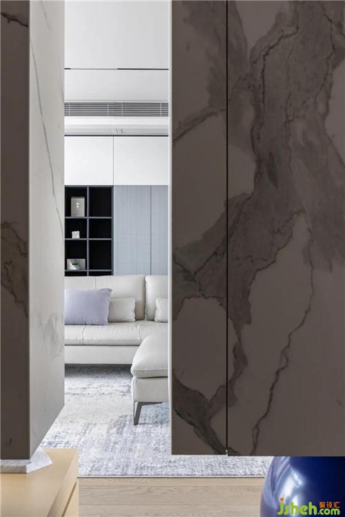 進門玄關,利用建筑中的盒子手法來做設計,鞋柜旁特意留了空隙,讓視覺可以穿透至客廳,給空間增加了趣味以及靈活性。從天而降的巖板幾何柱體若是做成頂天立地的造型會減弱通透的效果,深圳室內設計師利用圓體作為支撐,將數(shù)學美學詮釋得到位且驚艷!玄關鏡處一整面墻的柜體與幾何柱體支撐了強大的收納,線條簡潔更是無需多余的裝飾。