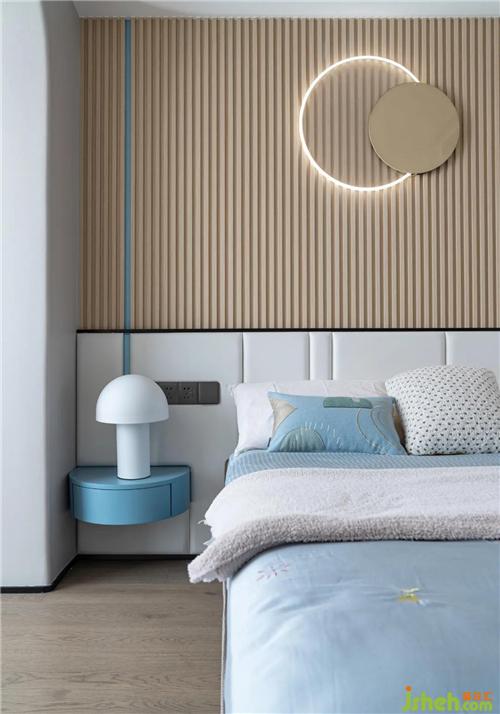 藍(lán)色半圓的懸空床頭柜,可以有效避免直角帶來的沖擊與傷害,顏值也十分在線,很推薦備給兒童房。