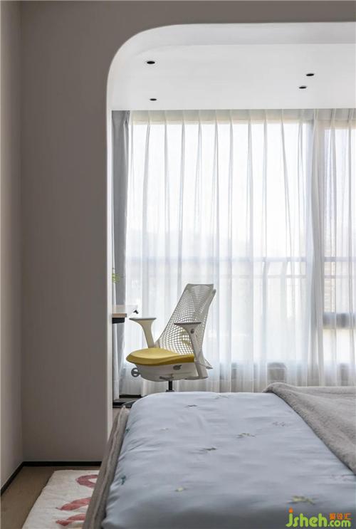 兒童房的天花及連接陽臺區(qū)域的門都做了弧形的設(shè)計,生硬不再而圓潤有加。拋去常規(guī)直來直往的線條帶來的沖擊,更適合小朋友~