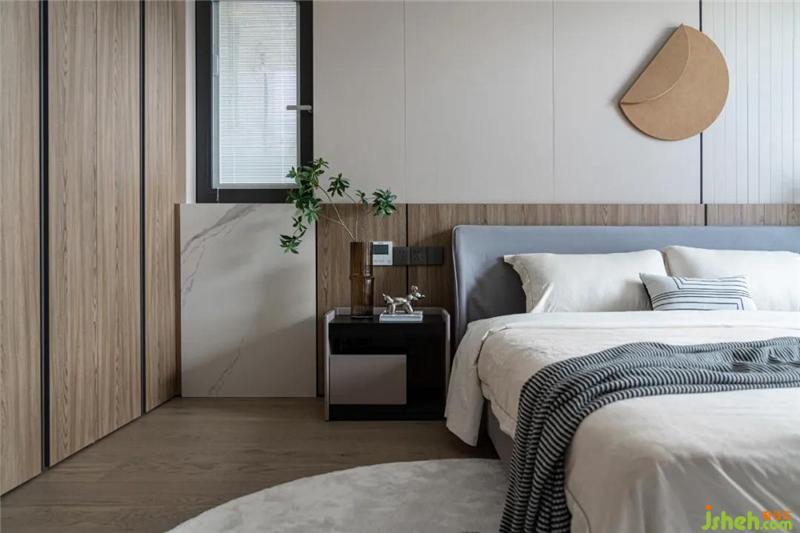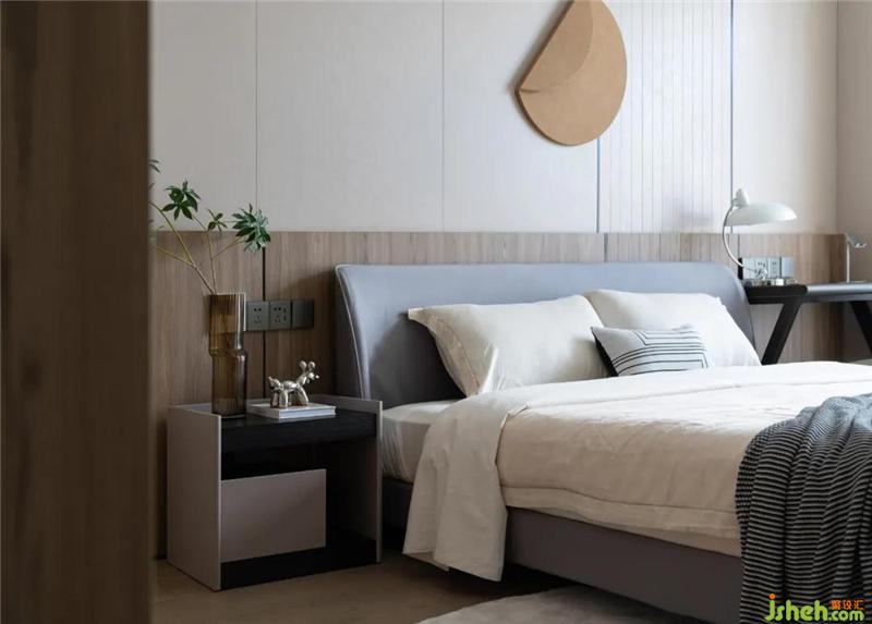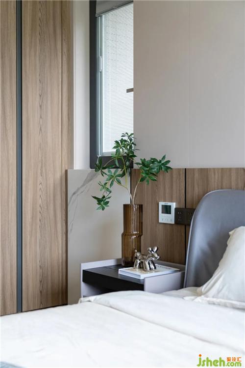 床頭兩側(cè)做了床頭柜+小辦公桌的設(shè)計區(qū)分功能。房間不管是衣柜、床頭背景或是地板均輔以木材,溫馨也更環(huán)保健康。細(xì)看鋼條點(diǎn)綴細(xì)節(jié),以致于不那么沉悶。