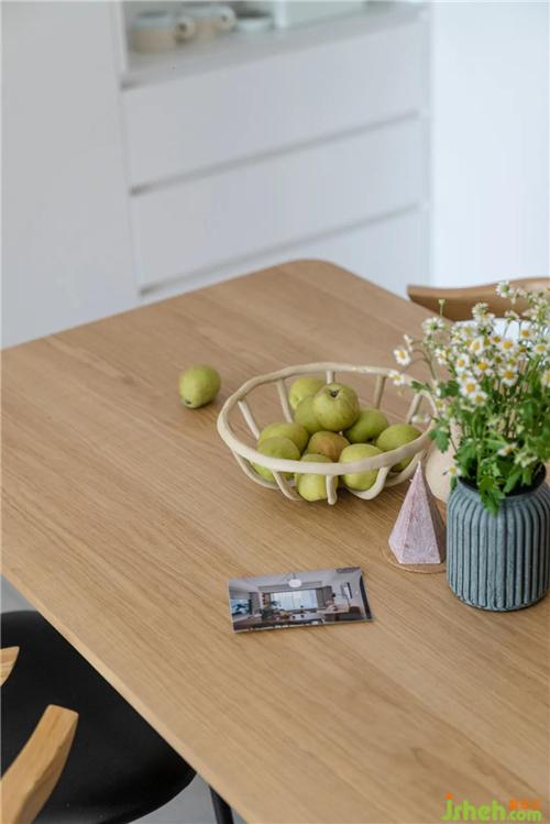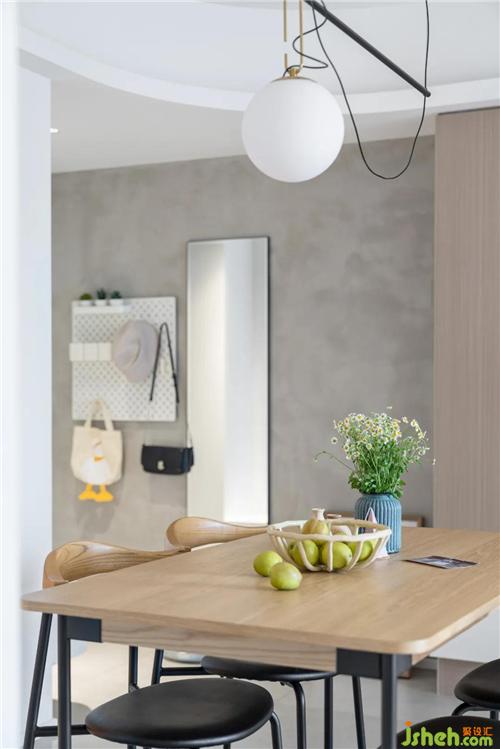 窗簾拉開,采光立馬能穿透整個客餐廳,大面積的淺色系+小面積的深色點綴,達到一個美的平衡點。餐桌上的一束小花、一盆沁甜怡人的水果,將自己熱忱的一面積極展示給生活~
