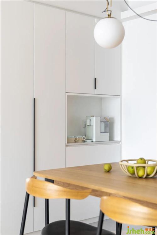根據(jù)屋主的需求,設置了餐邊柜,白色的柜體與墻面融為一體,視覺上干凈整體,做了部分開放處理,預留了插座放置飲水機,讓生活更加便捷。