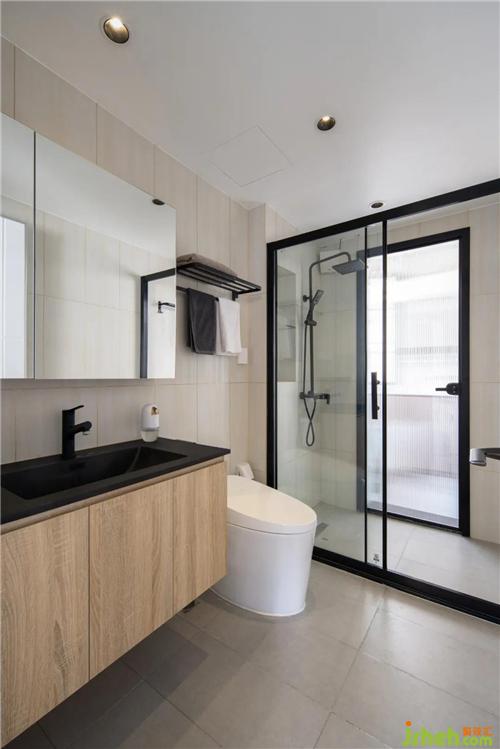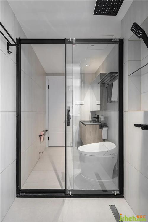 衛(wèi)生間原本陰暗狹小,改造為干濕分離,原生活陽(yáng)臺(tái)的動(dòng)線由廚房改為衛(wèi)生間,選擇透光不透人長(zhǎng)虹玻璃門,增加了廚房的操作臺(tái)面,也增加了衛(wèi)生間的采光。
