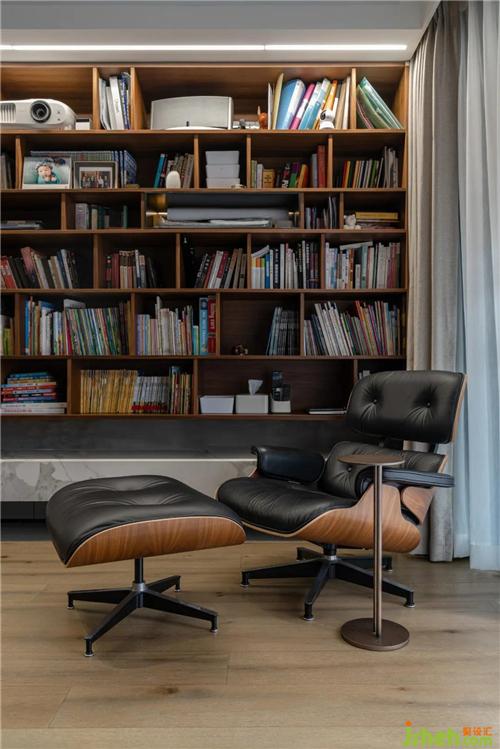經(jīng)典的Eames躺椅成了全家最愛的角落,人體工學(xué)的精準(zhǔn)設(shè)計帶來舒適的坐感。窩在里面看本書或者看部電影,都十分愜意。書架下面兩層放了小朋友的書,他喜歡自己在書架上找書看;上面四層則放了大人的書,最上層還收納了投影儀和小型音響。