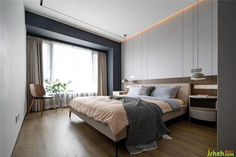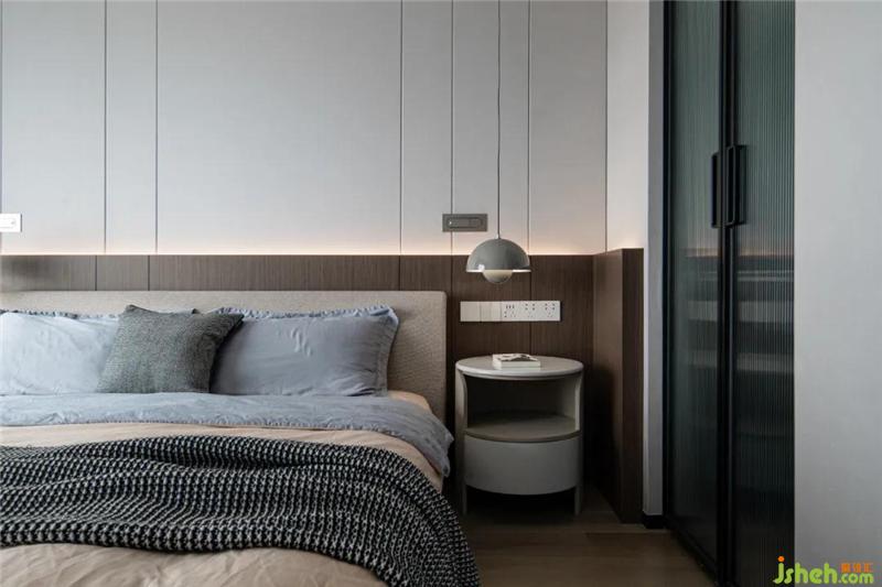 床頭的燈光是經(jīng)過精心設(shè)計的。向下的吊燈光照范圍較小,適合臥室的氛圍;另外參考酒店的配置,增加了一組閱讀燈,光線十分聚焦,亮度又足夠,滿足晚間閱讀的需求,但又不會影響伴侶。