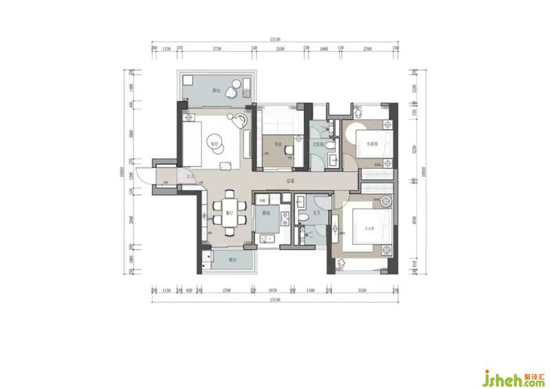 餐廳區(qū)域在家具的選擇上,大理石臺面的餐桌與體型較輕巧的灰色餐椅組合,具備質(zhì)感卻不會顯得笨重。