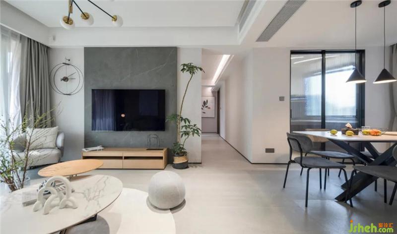 客餐廳為一個整體,兩邊的陽臺通透讓空間更加明亮。電視背景墻采用深灰的巖板+乳膠漆,兩種材質(zhì)結(jié)合,突出墻面的層次感的同時更具質(zhì)感,巖板帶來的冷冽剛好能被乳膠漆柔和。前期與屋主的溝通過程中,粗糙紋理及表面的石材更適合這個家,所以選擇了石材作為背景墻的主要材料,區(qū)別于一般的全乳膠漆背景墻及全巖板背景墻,更具特色。