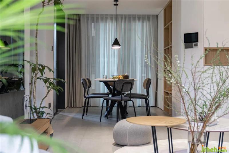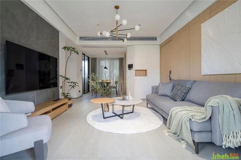 陽臺看向客餐廳區(qū)域,軟裝家具的選擇上,以灰色為主調(diào),些許木色的撞色,綠植的搭配給空間增加了一些活躍的感覺。