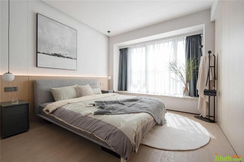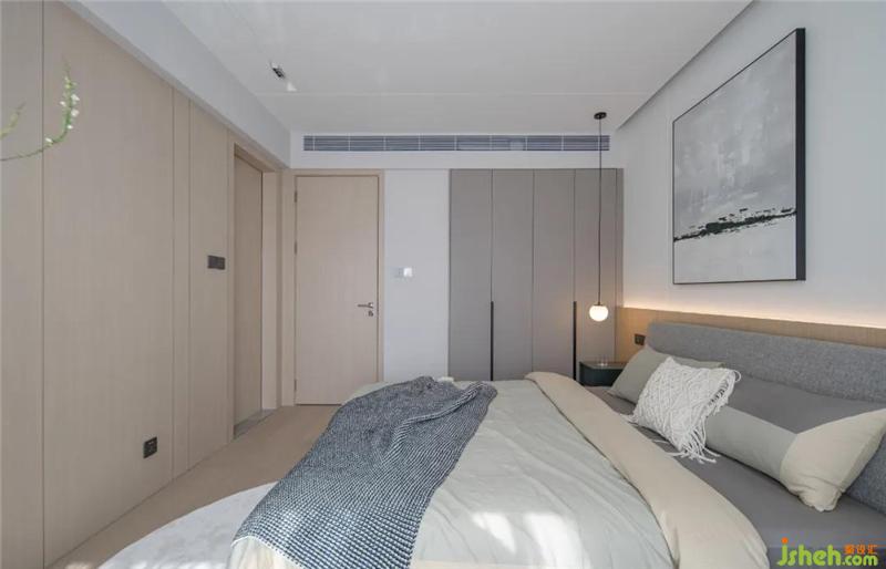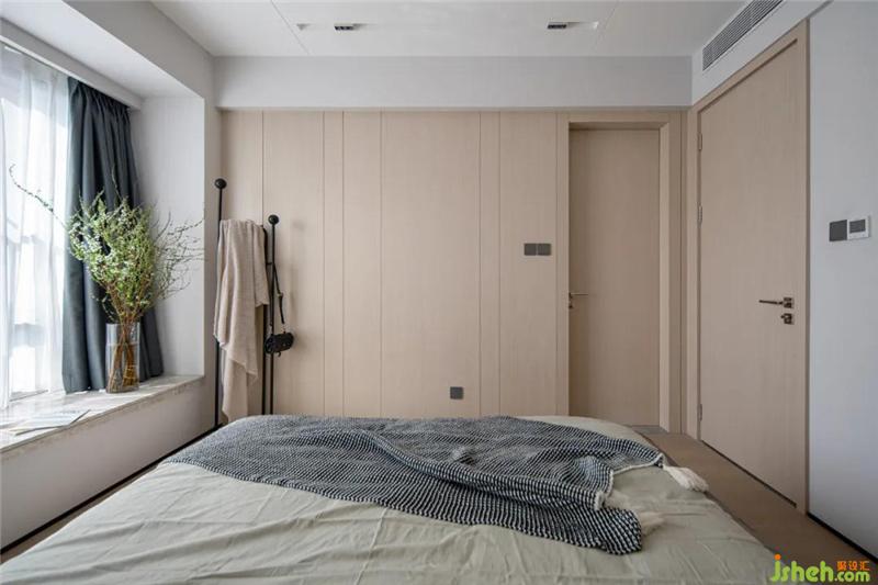 主臥整體延續(xù)了客餐廳的設(shè)計(jì),床頭背景墻從天花一直延續(xù)到地面,兩種不同材質(zhì)的碰撞,豐富了整個(gè)背景墻。