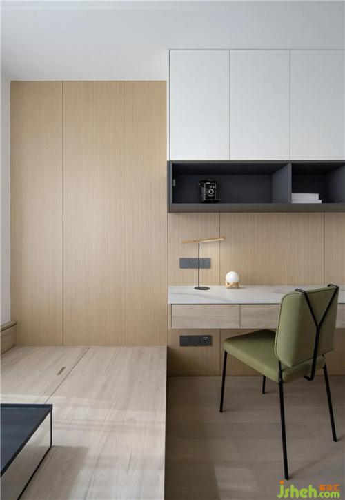 床頭一側(cè)除了留出的辦公的位置及吊柜,其他都用木飾面做了裝飾,與客餐廳整體風(fēng)格一致。