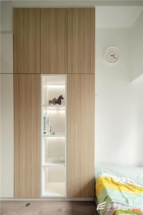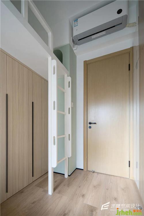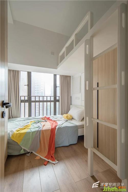 兒童房是錯(cuò)位上下鋪的設(shè)計(jì),上鋪的底部為衣柜區(qū)域,小小的空間也可以滿足儲(chǔ)物和日常使用的功能深圳室內(nèi)設(shè)計(jì)師,整個(gè)空間內(nèi)部還是以白色+木色為主,加上果綠的色調(diào)點(diǎn)綴,軟裝上用比較童趣的彩虹色,氛圍感十足
