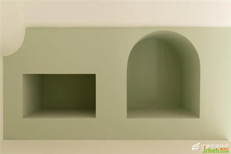 在上鋪的區(qū)域制作了兩個(gè)可愛造型的凹洞,可作為上鋪的床頭柜使用或者放置一些小物件。果綠色的墻體作為體塊獨(dú)立的存在,選用了其他顏色,給空間內(nèi)部增加一些童趣的氛圍~