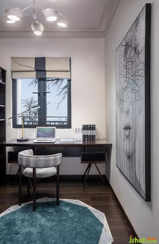 藏青色地毯與水墨色人像裝飾畫蘊含著安穩(wěn)與沉靜的力量,在明媚午后,手持書卷,獨酌清茶,悠閑自在。