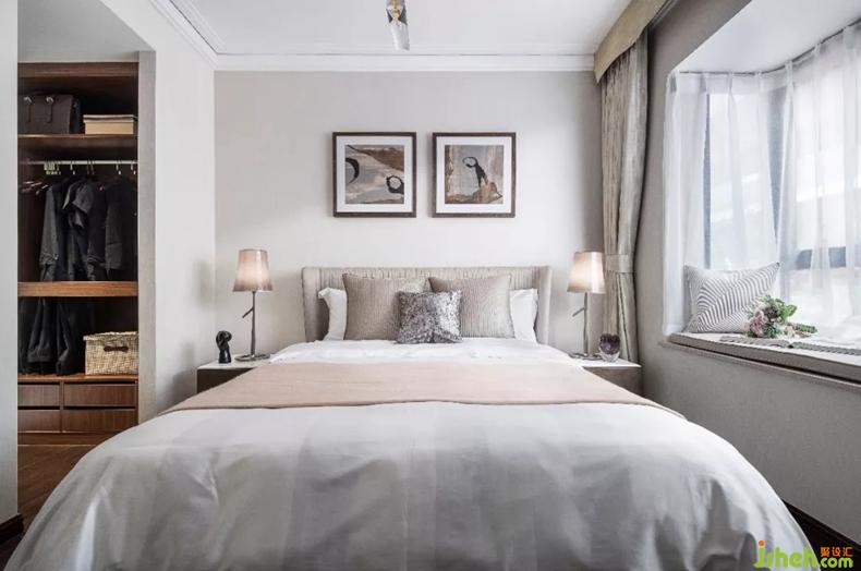 睡眠空間可以很優(yōu)雅,也可以很知性。設(shè)計師保留米色背景,再選用海星藍(lán)、香檳金、橡皮粉等床品,營造浪漫、柔和的氛圍。