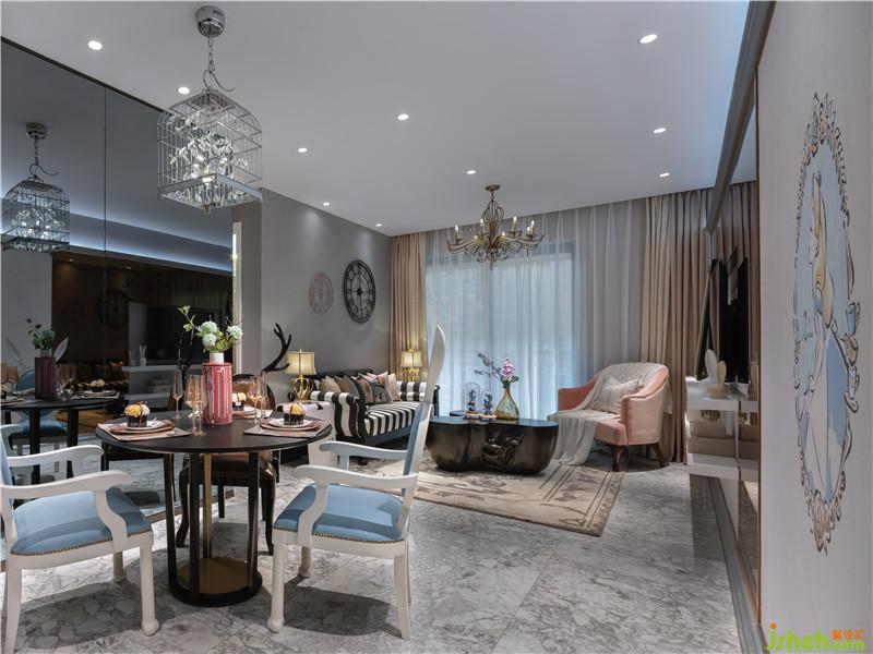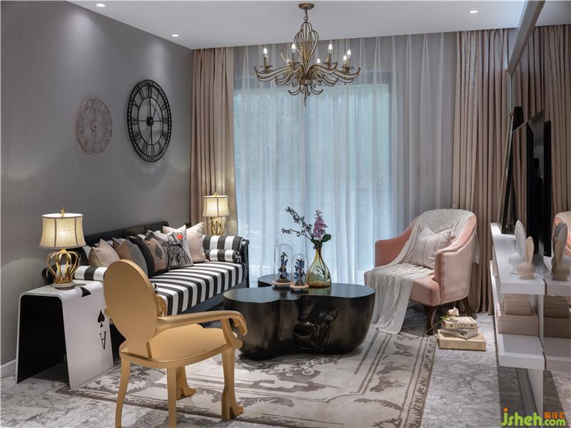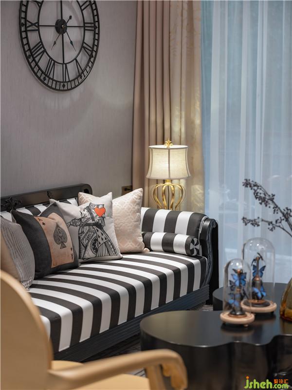 鐘表形狀的墻面裝置、撲克梅花形茶幾、粉色沙發(fā)、黑白條紋沙發(fā)、明黃色休閑椅、英式燭臺形吊燈......仿佛下一秒大腦袋的紅皇后就會出現(xiàn)在眼前。這些元素的搭配是風格的碰撞,更是現(xiàn)實生活與幻理想世界融合。深圳裝修公司