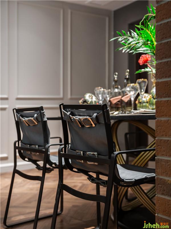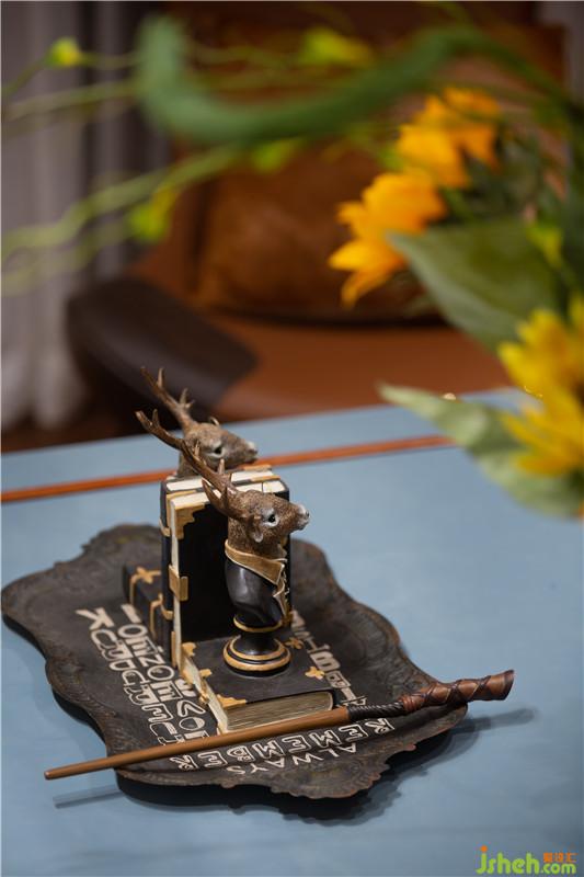 魔法書拼就的墻面、復古做舊的行李箱矮幾、貓頭鷹底座臺燈、星象儀吊燈、各式南瓜小飾物......粘連起客廳的魔法元素,經由魔杖“施咒”,組合成一個有趣的魔法休閑空間。深圳裝修公司
