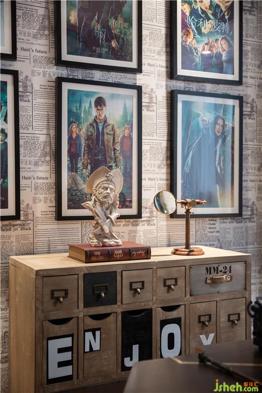 墻面鋪滿復(fù)古式報紙樣式的墻紙,讓人不由聯(lián)想到《哈利波特》中的預(yù)言家日報,各類英式精致飾物為空間更添英倫氣息。深圳裝修公司