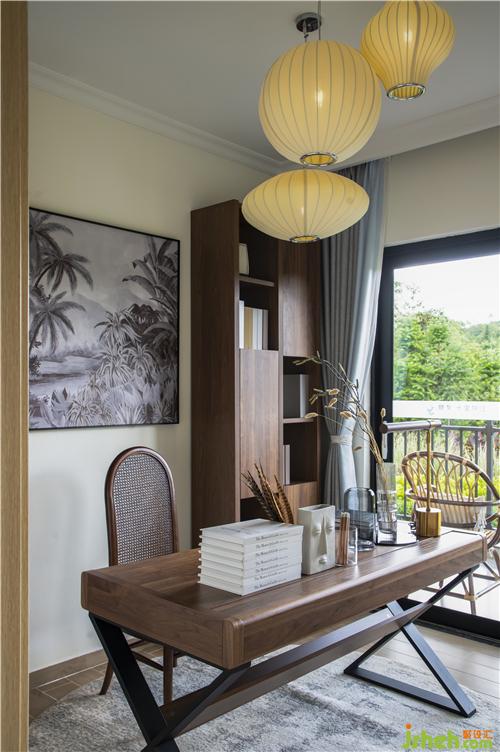 落地窗保留了書房的通透性,硬朗深色的書架與書桌風(fēng)格相比客廳稍微沉穩(wěn)。面對(duì)知識(shí)我們要丟掉一顆浮躁的心,靜靜的去吸收。