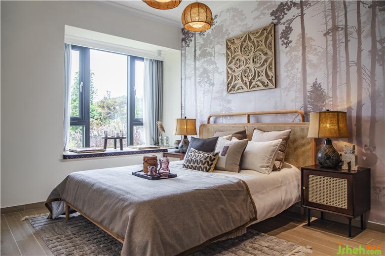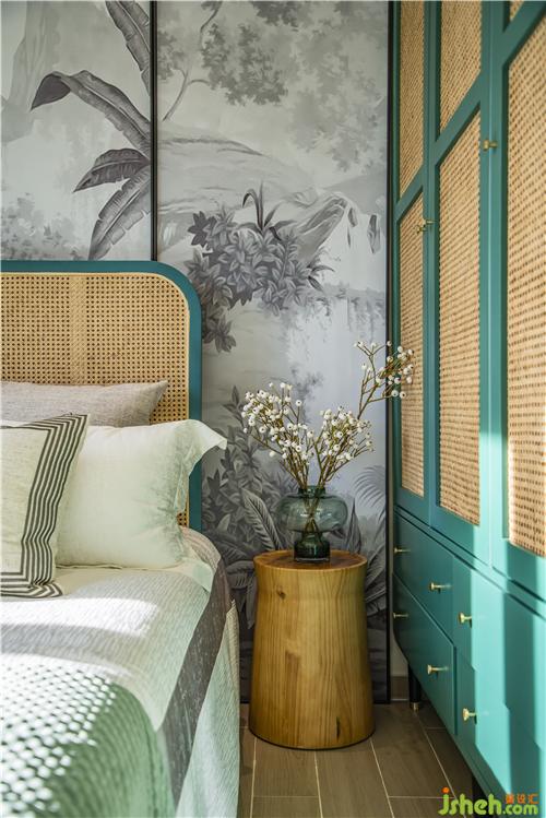 臥室墻面采用素色綴以復(fù)古紅,素雅之間又散發(fā)出摩登的復(fù)古感。天然藤編床為臥室增添了自然舒適的意味。精美的裝飾品讓一切柔和寧謐,沒有銳利的尖角,愜意休閑。