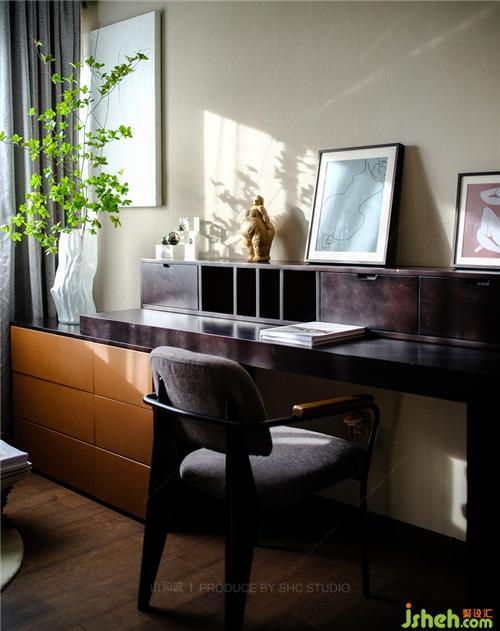 書(shū)房延續(xù)空間的整體色調(diào),作為男主人的個(gè)人空間,裝飾上更顯大膽,皮革、金屬石材、布藝增添層次感,局部配以時(shí)尚藝術(shù)品,不同的材質(zhì)與材質(zhì)與觸感都營(yíng)造著室內(nèi)的高級(jí)精品與藝術(shù)感,彰顯男主人的格調(diào)。