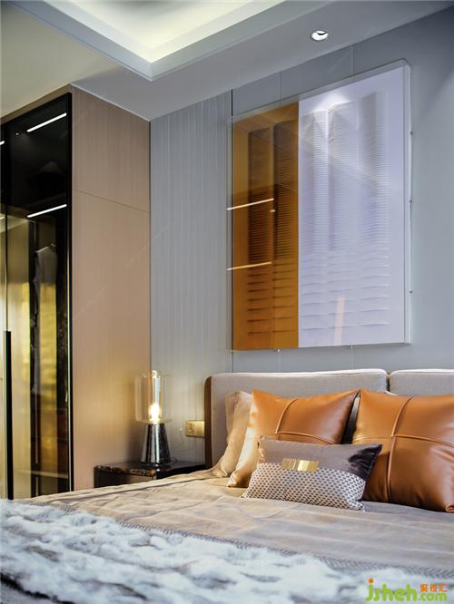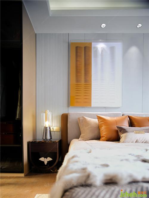 臥室內(nèi)灰白金的色彩對(duì)撞,盡顯高雅與浪漫。再配以溫暖舒適的床品,營(yíng)造出居家的溫潤(rùn)質(zhì)感。大理石桌面的床頭柜與皮質(zhì)的床上抱枕、優(yōu)雅高貴的皮草相輔相成,突出了整個(gè)空間的質(zhì)感,亦展示了女主人的高雅品味。